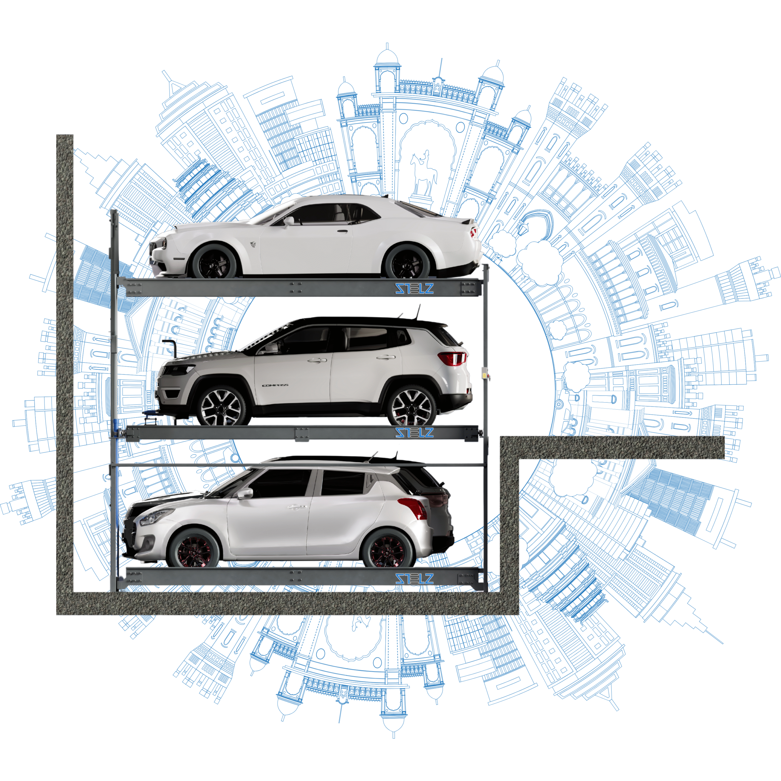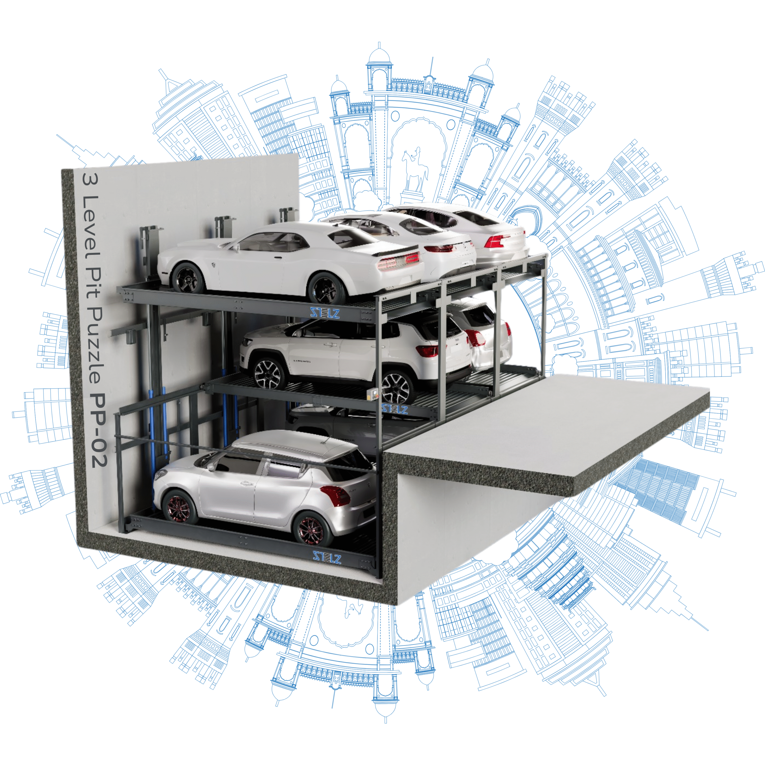 The 3-Level Pit Puzzle Parking System is an advanced, fully automatic solution designed to maximize parking capacity in tight spaces. It allows cars to be parked on three vertical levels, with one at ground level and two below in the pit, while the horizontal puzzle movement enables flexible car retrieval without disturbing other vehicles. This makes it highly efficient for residential complexes, commercial projects, hotels, and urban developments where space is at a premium. The system combines safety, convenience, and smooth hydraulic operation with minimal maintenance requirements. It is a modern, high-density parking solution for developers and users seeking smarter, space-saving alternatives to traditional parking.